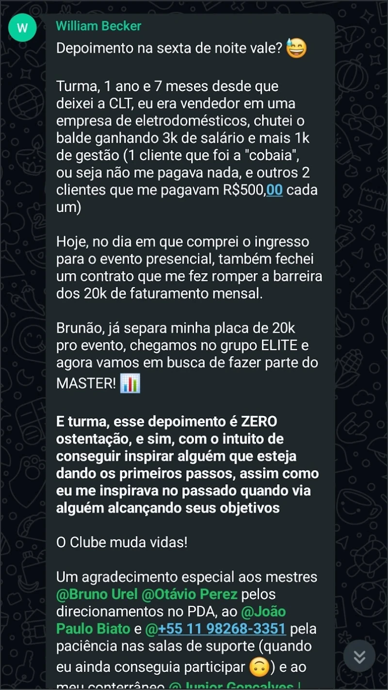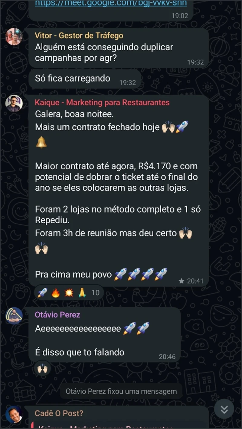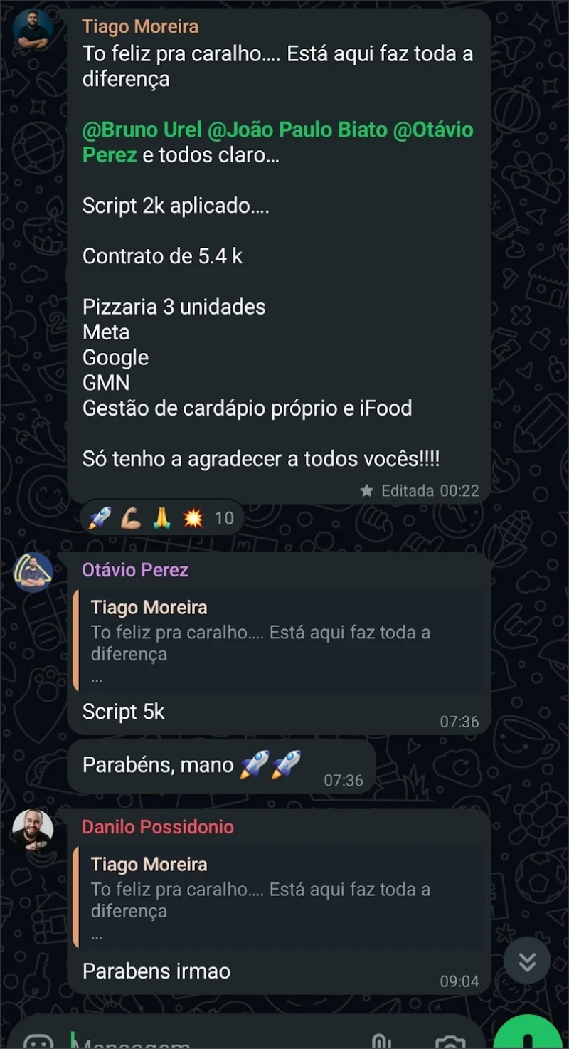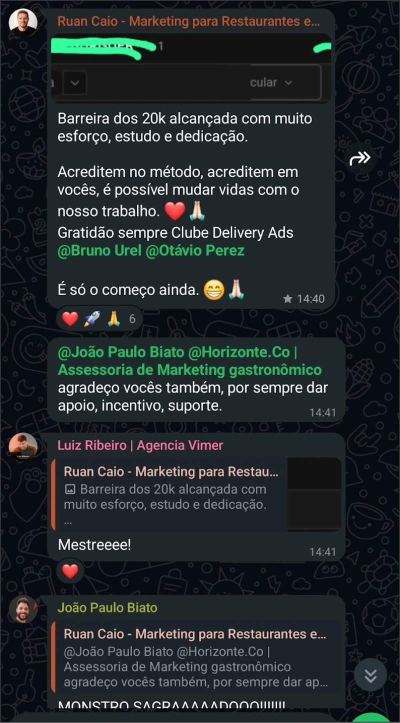 Fundador da To Eat, construí uma das maiores operações de agência de food marketing do Brasil, chegando a +50k/mês de faturamento no primeiro ano e meio de Clube e Mentoria. O que me trouxe até aqui não foi só resultado em tráfego: foi aprender a gerir pessoas, processos e clientes com organização.